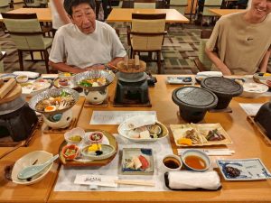 温泉で汗を流したあとは豪華な食事と美味しい日本酒でおなか一杯です。