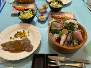テニスが一段落したら、宿に戻り、風呂で汗を流した後に夕食です。