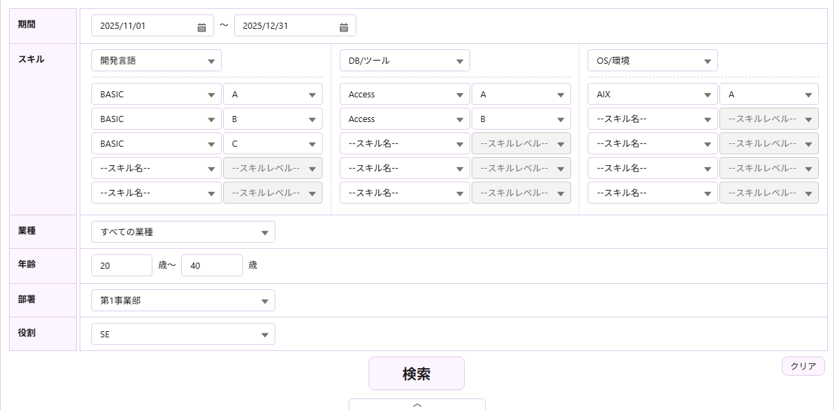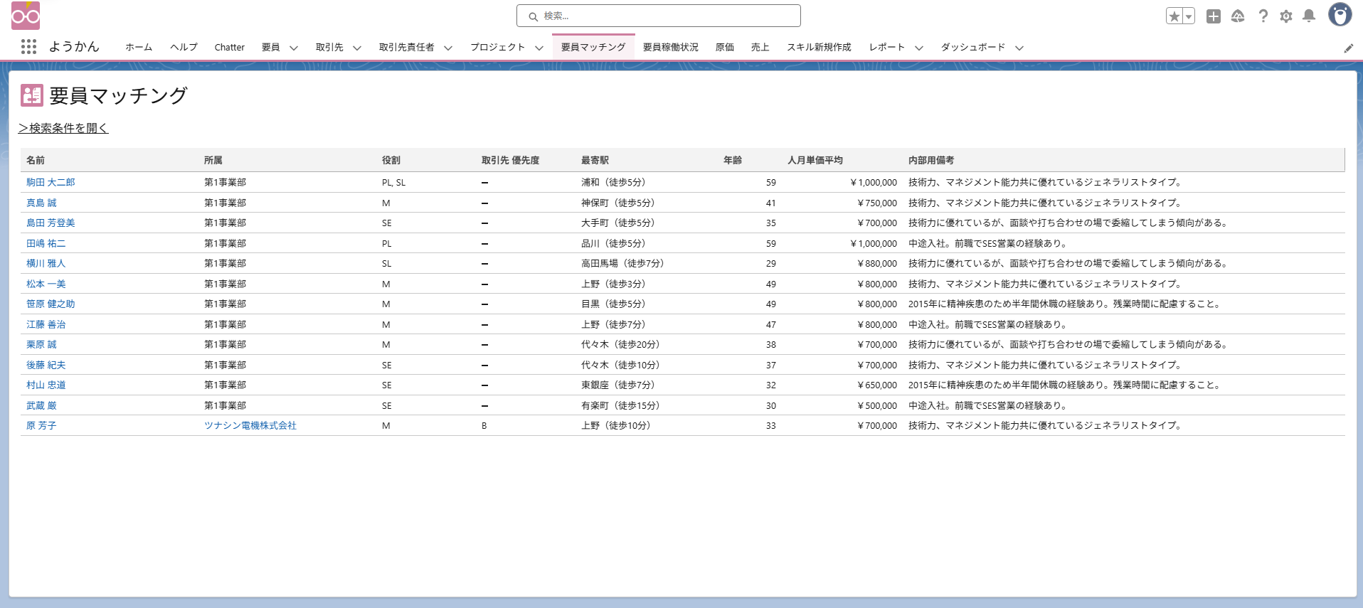 上部タブからアクセスできる「要員マッチング」画面は正常に利用できますので、プロジェクトの情報を検索条件に手入力し、要員マッチングを実施してください。