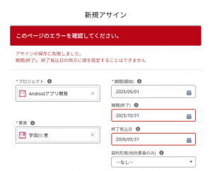 アサイン:期間(終了)と終了見込日の同時入力不可