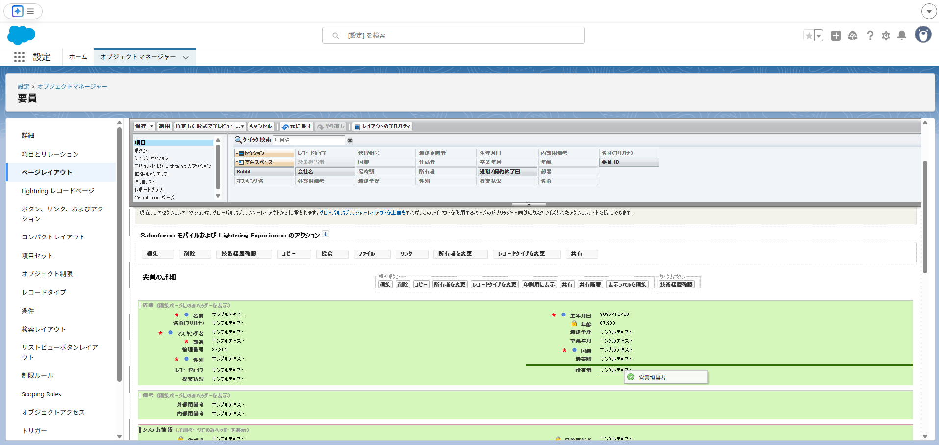 ⑥ 画面上部の「営業担当者」をドラッグアンドドロップで最寄駅と所有者の間へ配置(レコードタイプの横)