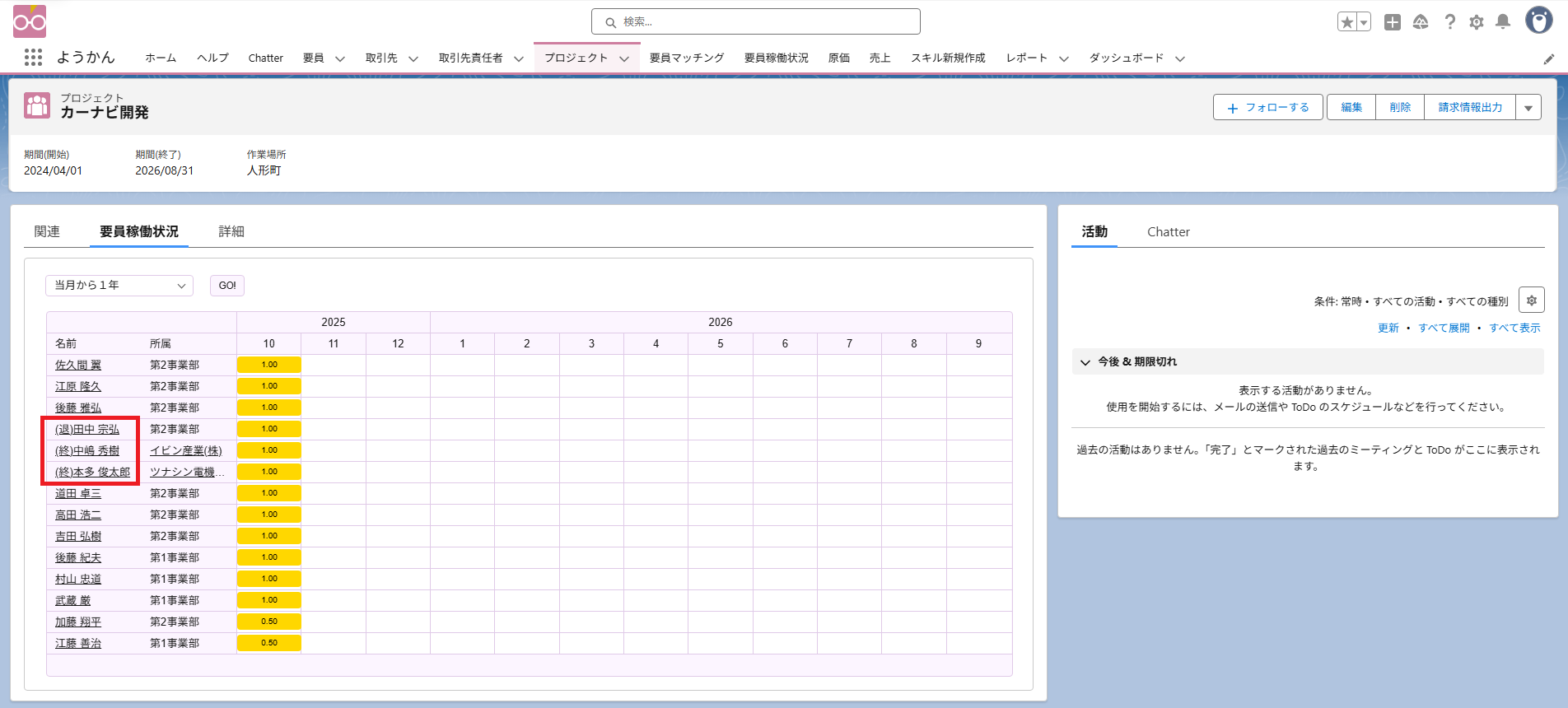 プロジェクト別要員稼働状況