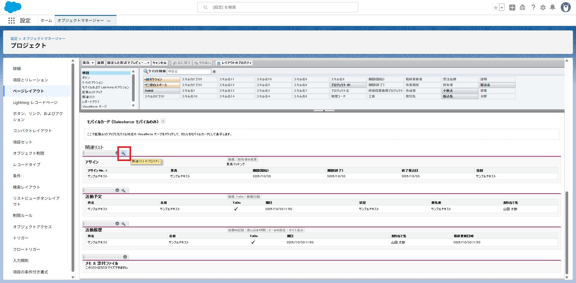 ⑥ 関連リストのプロパティー アサイン画面のボタンセクション右部にある「+」をクリック